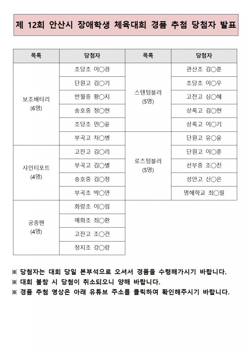 제12회 안산시 장애학생 체육대회 경품 추첨 당첨자 안내