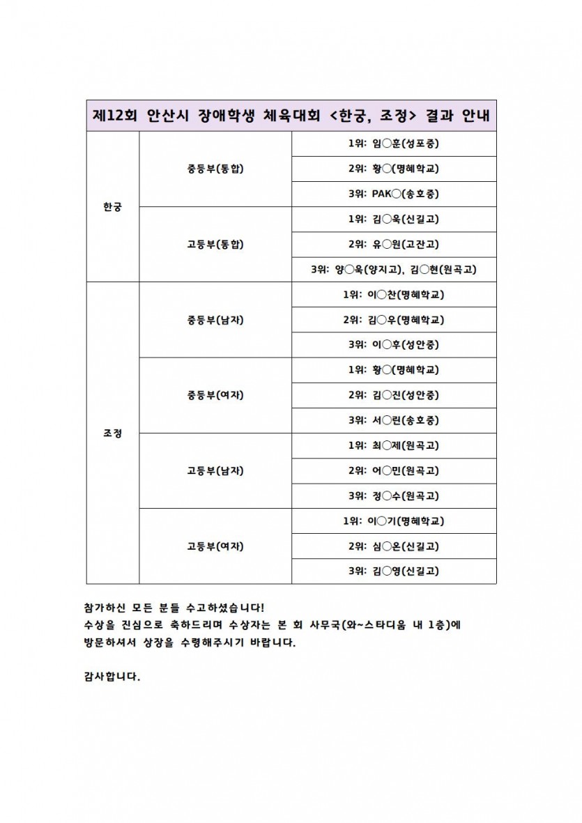 제12회 안산시 장애학생 체육대회 <한궁, 조정> 결과 안내 페이지 정보 작성자 최고관리자 조회 2,432회 작성일 23-09-25 17:46 본문 목록 이전글2023년 안산시 세대공감 전국 한궁대회 23.10.05 다음글제12회 안산시 장애학생 체육대회 경품 추첨 당첨자 안내 23.09.14