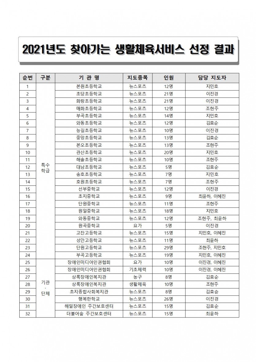 2021년 찾아가는 생활체육서비스 선정결과 안내