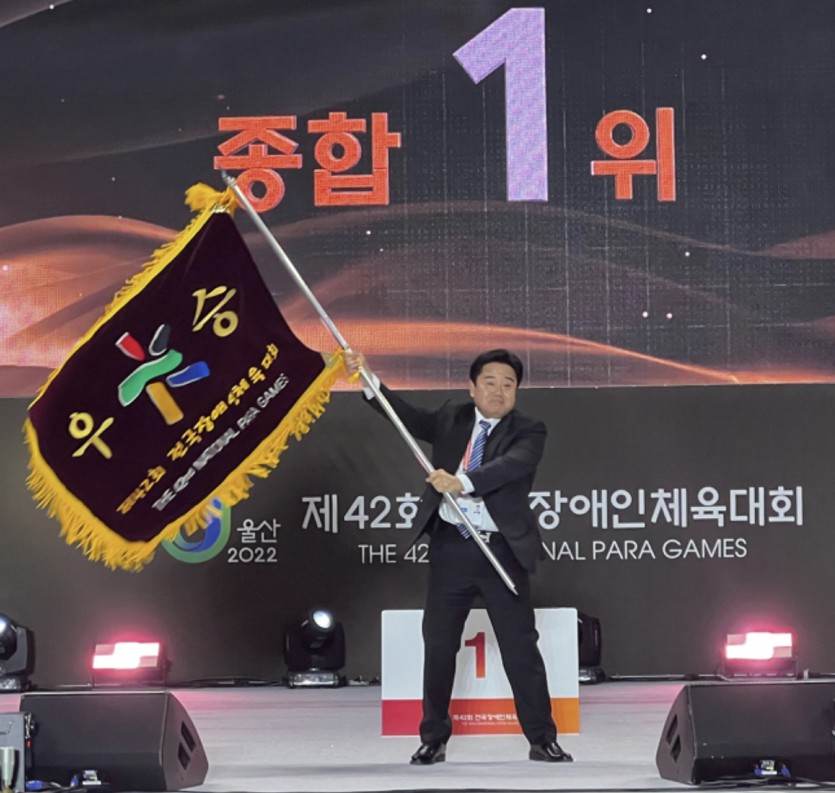 백경열 경기도선수단 총감독(경기도장애인체육회 사무처장)이 시상식서 우승기를 받아 힘차게 흔들고 있다.경기도장애인체육회 제공