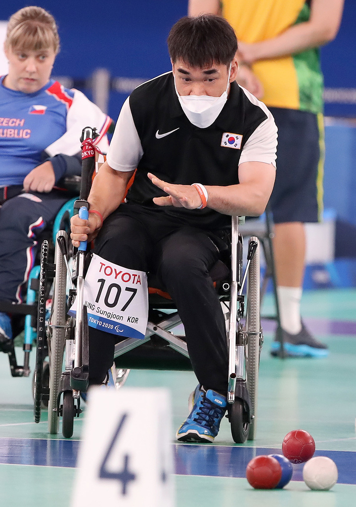 28일 일본 도쿄 아리아케 체조경기장에서 열린 2020 패럴림픽 보치아 개인전 예선에서 정성준(43·경기도), 정호원(35·강원도장애인체육회), 김한수(29·경기도)가 나란히 승리했다.